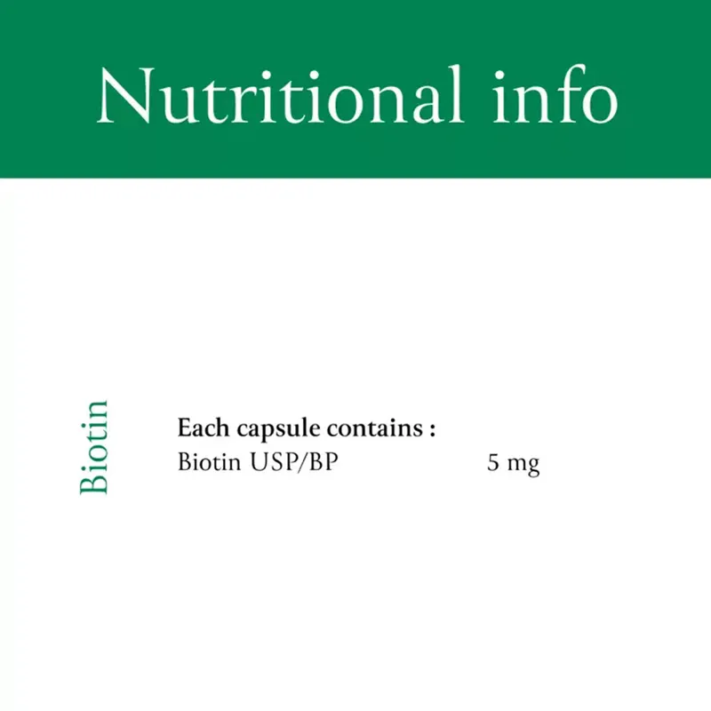BioLife Nutrition Biotin 5mg is a high-strength B-vitamin supplement supplied as 60 Capsules, essential for healthy hair, skin, and nails.