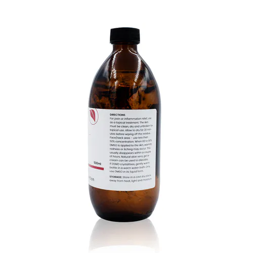 High-purity 99.9% Dimethyl Sulfoxide (DMSO) (500ml) for topical use as a pharmaceutical grade solvent.
