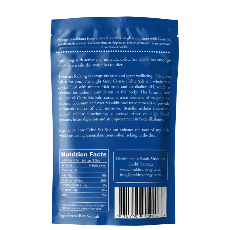 Experience the natural benefits of Celtic Sea Salt Light Grey Coarse, sourced from clean coastal waters. This raw, unprocessed salt is abundant in over 80 trace minerals, including magnesium, calcium, and potassium, essential for promoting hydration, digestion, and balanced blood pressure. Its alkaline pH aids in sodium assimilation, supporting optimal health. Perfect for enhancing any dish, this salt delivers exquisite flavour and nutrition