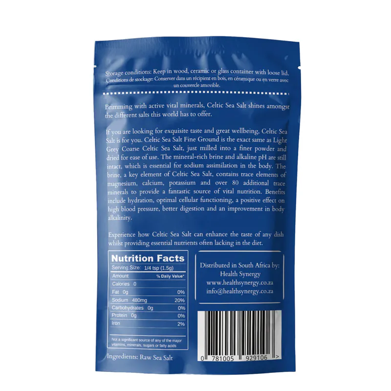Celtic Sea Salt Light Grey Fine Ground is a natural, unrefined salt supplied in a 250g container.