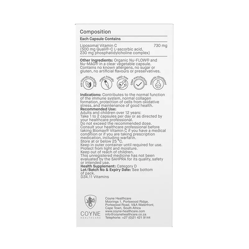 • Supports Collagen Formation & Overall Well-being: By promoting collagen synthesis, Coyne Biomax® Vitamin C Liposomal assists in maintaining healthy skin, connective tissues, and joints. Experience the benefits of radiant skin, flexible joints, and overall vitality with this advanced formula.