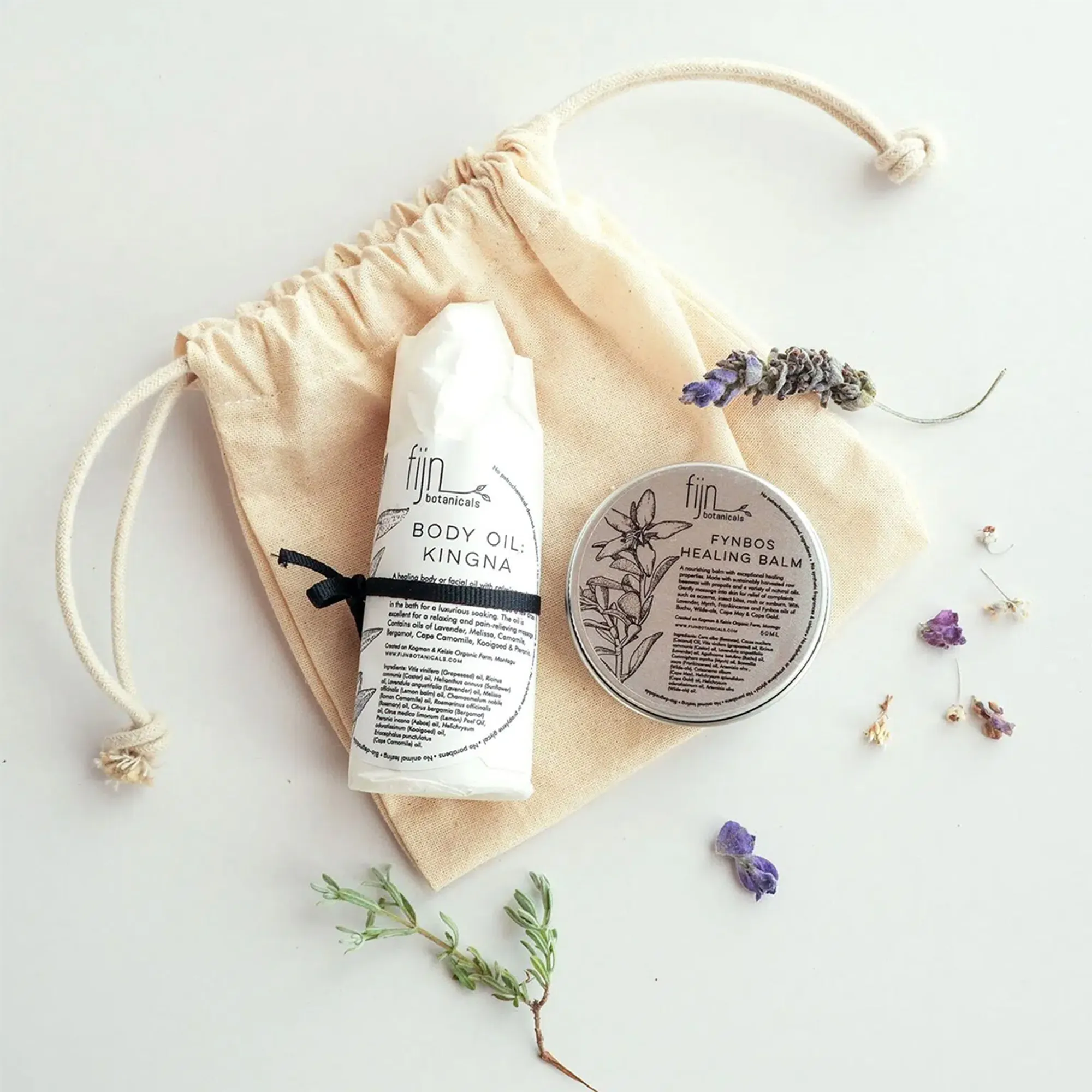 Fijn Botanicals With Love Heal Gift bag with 50ml glass vial of Kingna Body Oil and a 50ml Fynbos Healing Balm