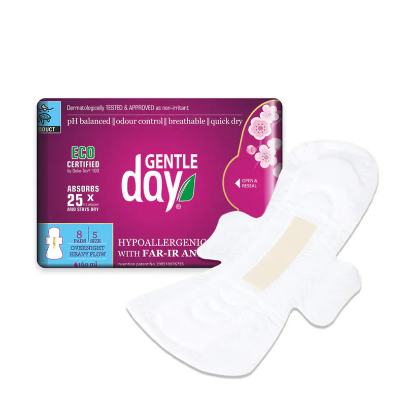 GENTLE DAY®pads are hypoallergenic, air permeable, ultra-thin, and highly absorbent - absorbing up to 10 times more than other pads. The ANION strip protects against bacteria and odor, while side walls prevent side leaks. Our pads are Oeko-Tex® 100 and VEGAN certified, and dermatologically tested as non-irritant.