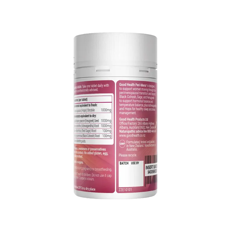 Good Health Peri Meno+ is a targeted supplement of botanicals and vitamins to support women through perimenopause, supplied as 60 Tablets.