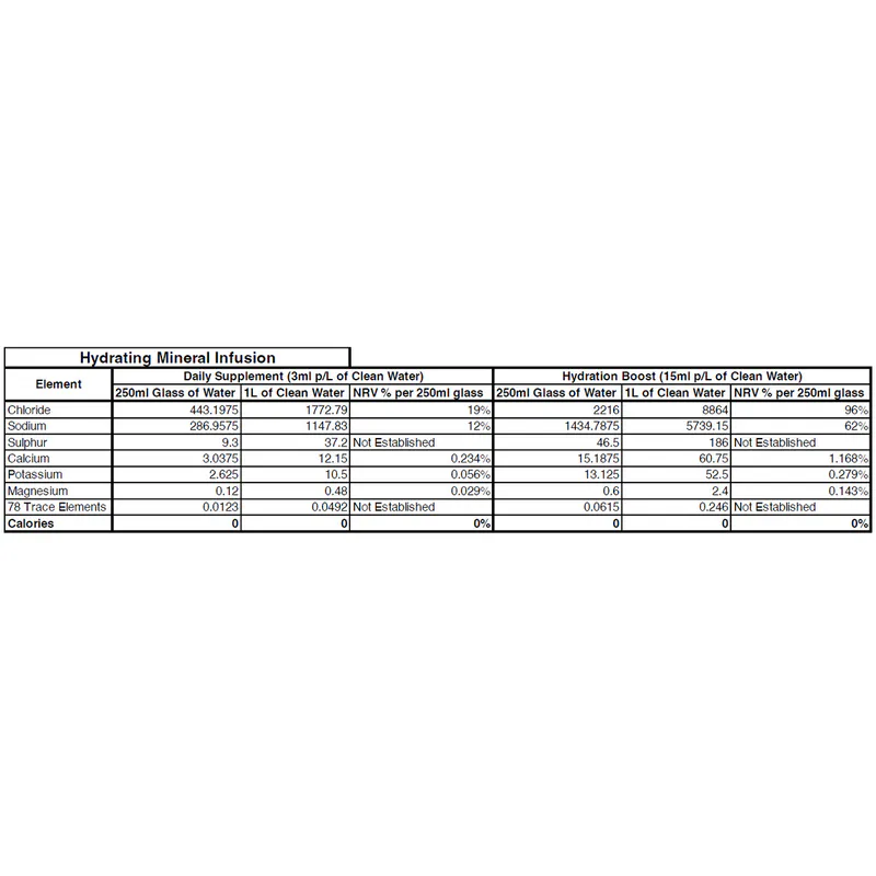 Hydration Boost: Add 15ml of Hydrating Mineral Infusion to 1L of clean water. Drink 500ml of this mineral-infused water before exercise, studying, or when feeling fatigued. Repeat as needed.