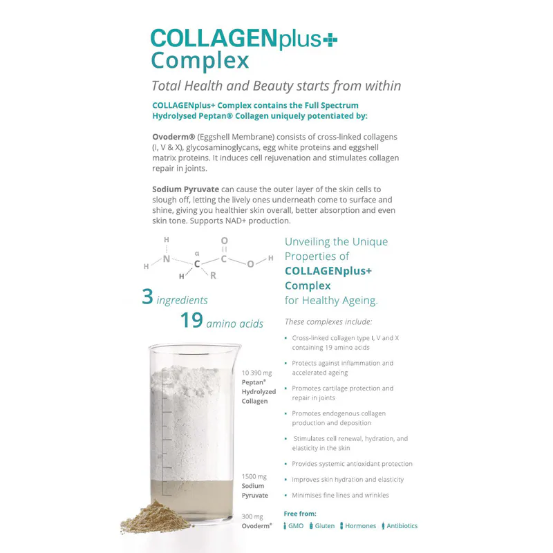 - Ovoderm® Eggshell Membrane (300 mg): A natural marvel, Ovoderm® is rich in collagens and proteins, offering protection and rejuvenation to the skin. This ingredient aids in enhancing skin's softness and smoothness, contributing to its overall health and resilience.