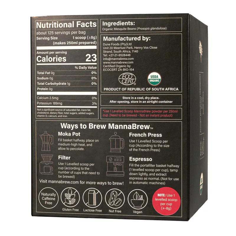MannaBrew is made of 100% Mesquite beans, roasted to perfection.