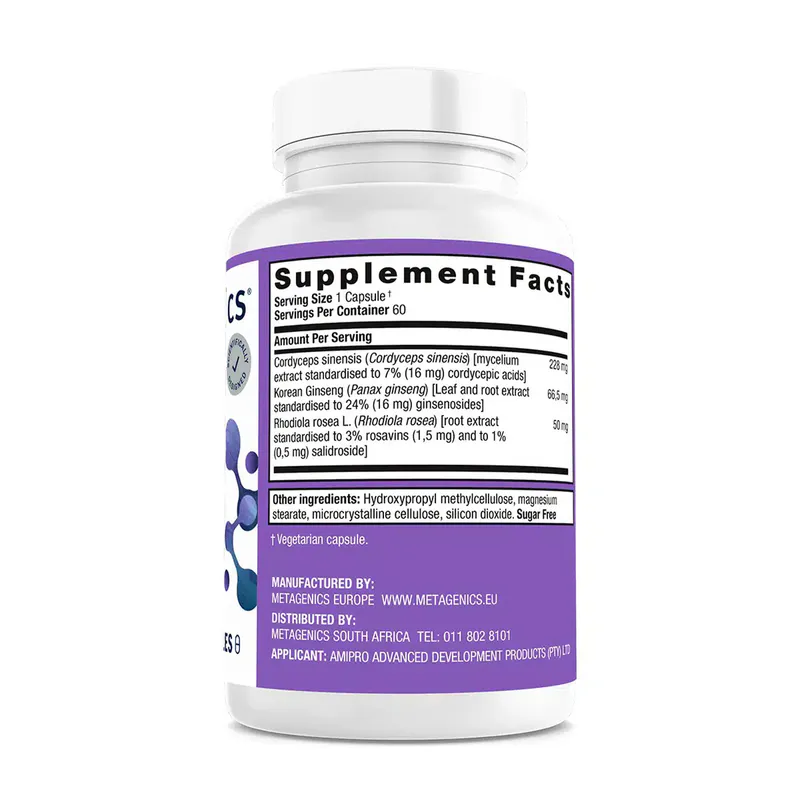 Adaptogenic herbal complex (60 Capsules) featuring Rhodiola and Cordyceps to support energy, focus, and resilience to stress-related fatigue.