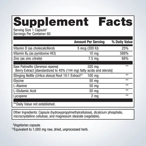 | Saw Palmetto (Serenoa repens) Berry Extract [standardized to 45% (144 mg) fatty acids and sterols] | 320 mg | * |