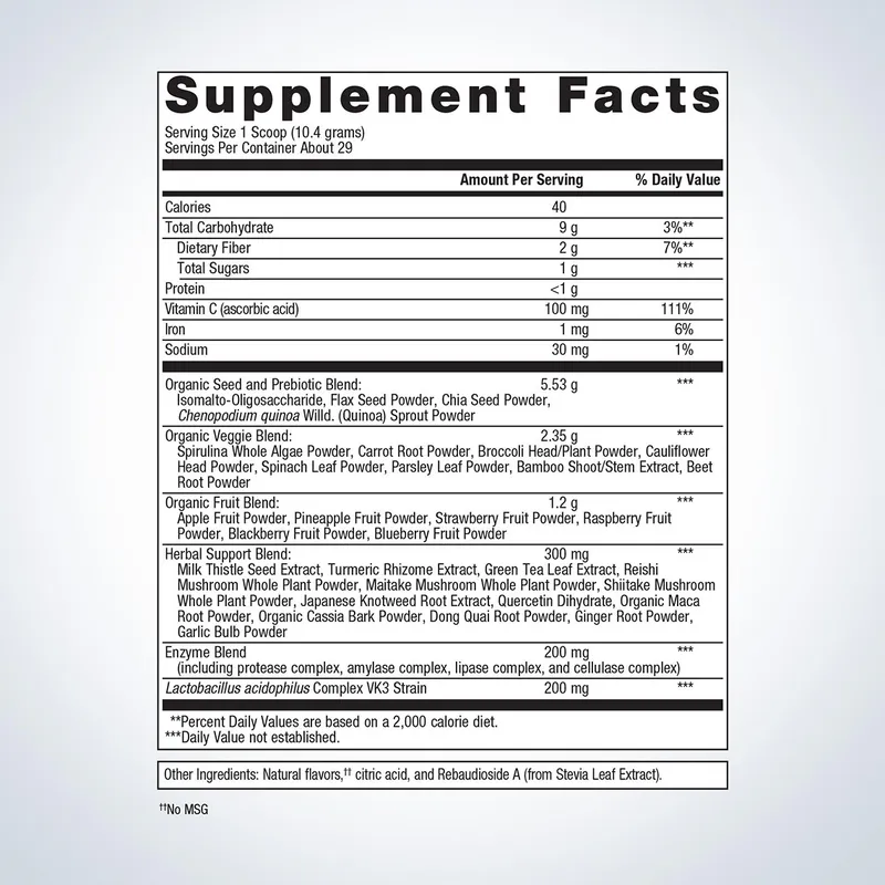 Key Benefits Daily greens powder drink – Provides a convenient way to get a nutrient-rich superfood boost Supports cellular health & healthy aging – Clinically tested ingredients proven to enhance cellular function† Aids digestion & gut health – With organic prebiotics, probiotics, and digestive enzymes* Strengthens immune function – Packed with antioxidant-rich green superfoods