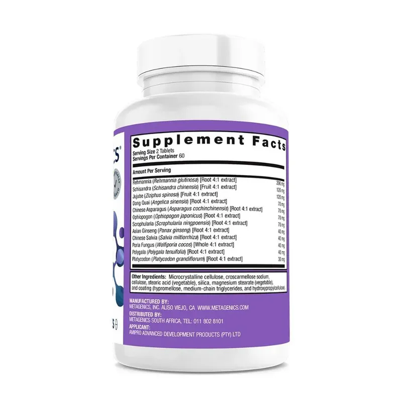 | A 4:1 Proprietary Herbal Extract Blend of: Rehmannia Root (Rehmannia glutinosa), Schisandra Fruit (Schisandra chinensis), Jujube Fruit (Ziziphus spinosa), Dong Quai Root (Angelica sinensis), Chinese Asparagus Root (Asparagus cochinchinensis), Ophiopogon Root (Ophiopogon japonicus), Scrophularia Root (Scrophularia ningpoensis), Asian Ginseng Root (Panax ginseng), Chinese Salvia Root (Salvia miltiorrhiza), Poria Fungus (Wolfiporia cocos), Polygala Root (Polygala tenuifolia), Platycodon Root (Platycodon grandiflorum) |