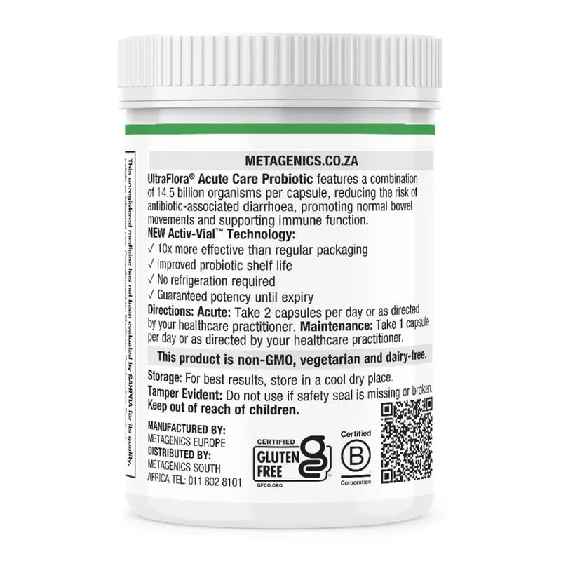 UltraFlora® Acute Care Probiotic by Metagenics features a combination of 14.5 billion organisms per capsule, reducing the risk of antibiotic-associated diarrhea, promoting normal bowel movements, and supporting immune function.