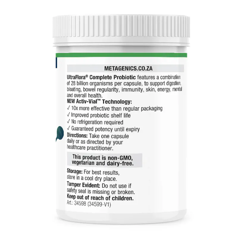 UltraFlora® Complete Probiotic by Metagenics® features a combination of 28 billion organisms per capsule, to support digestion, bloating, bowel regularity, immunity, skin, energy, psychological and overall health.