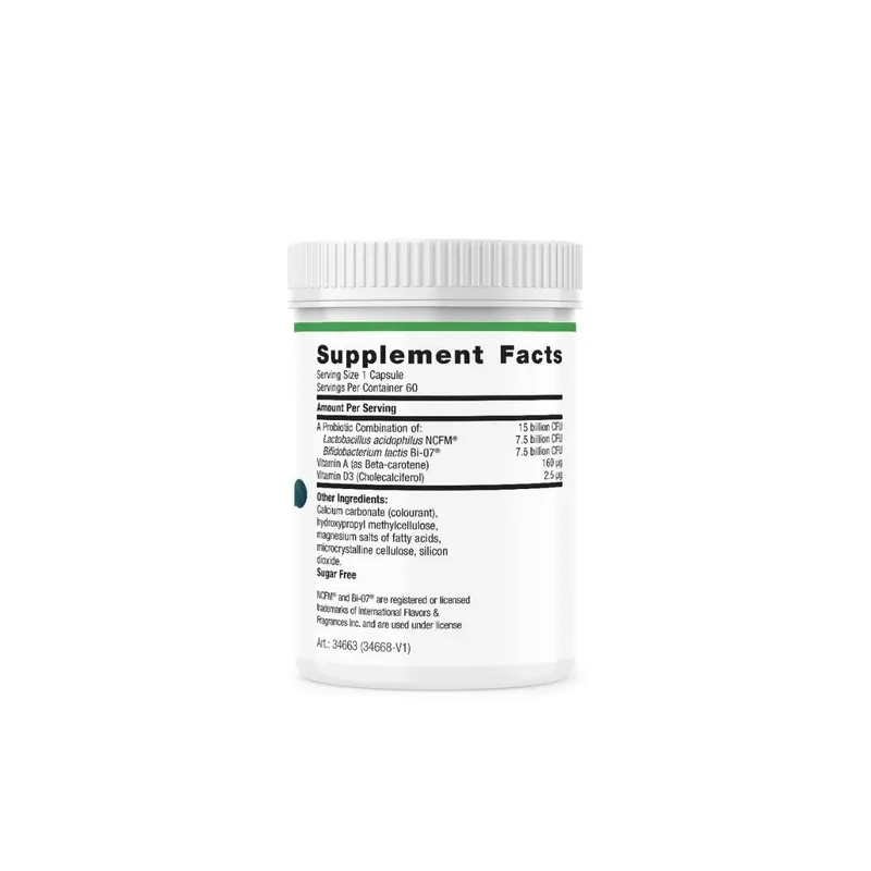 Per capsule: A Probiotic Combination of: 15 billion CFU > Lactobacillus acidophilus NCFM 7,5 billion CFU; > Bifidobacterium lactis Bi-07 7,5 billion CFU; Vitamin A (as Beta-carotene) 160 mcg; Vitamin D (as Cholecalciferol) 2,5 mcg (100 I.U.)