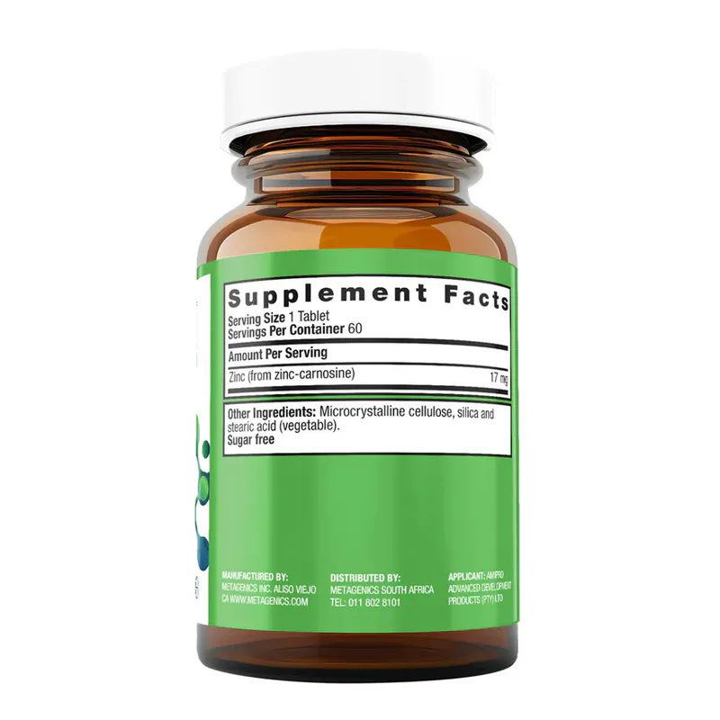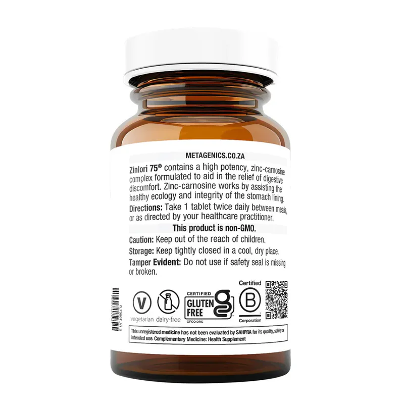 Zinlori 75® by Metagenics contains a high potency, zinc-carnosine complex formulated to aid in the relief of digestive discomfort. Zinc-carnosine works by assisting the healthy ecology and integrity of the stomach lining.