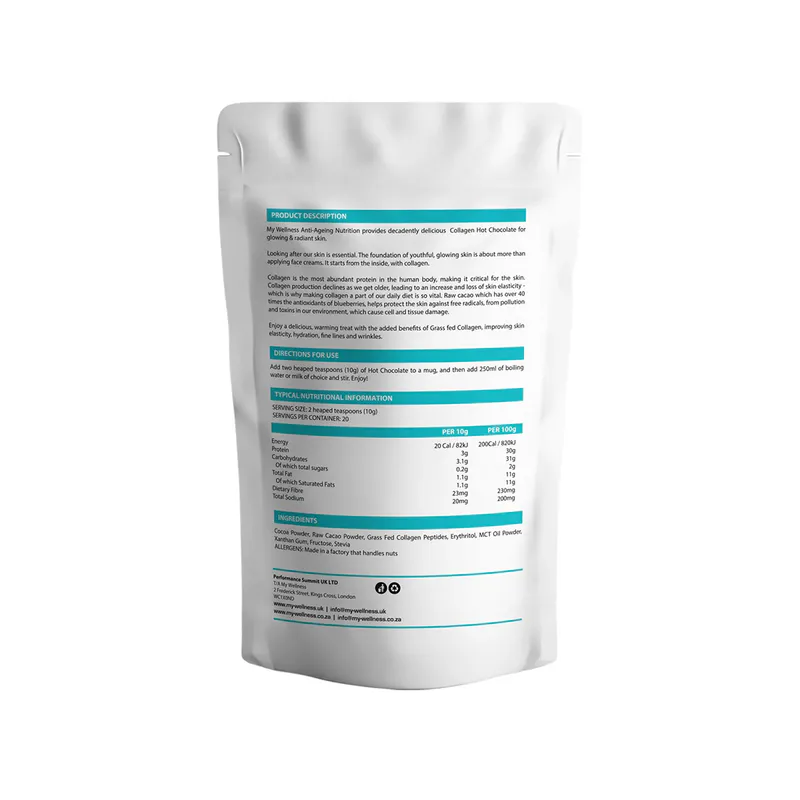 My Wellness Collagen Hot Chocolate is a beauty and wellness powder supplied in a 200g container.