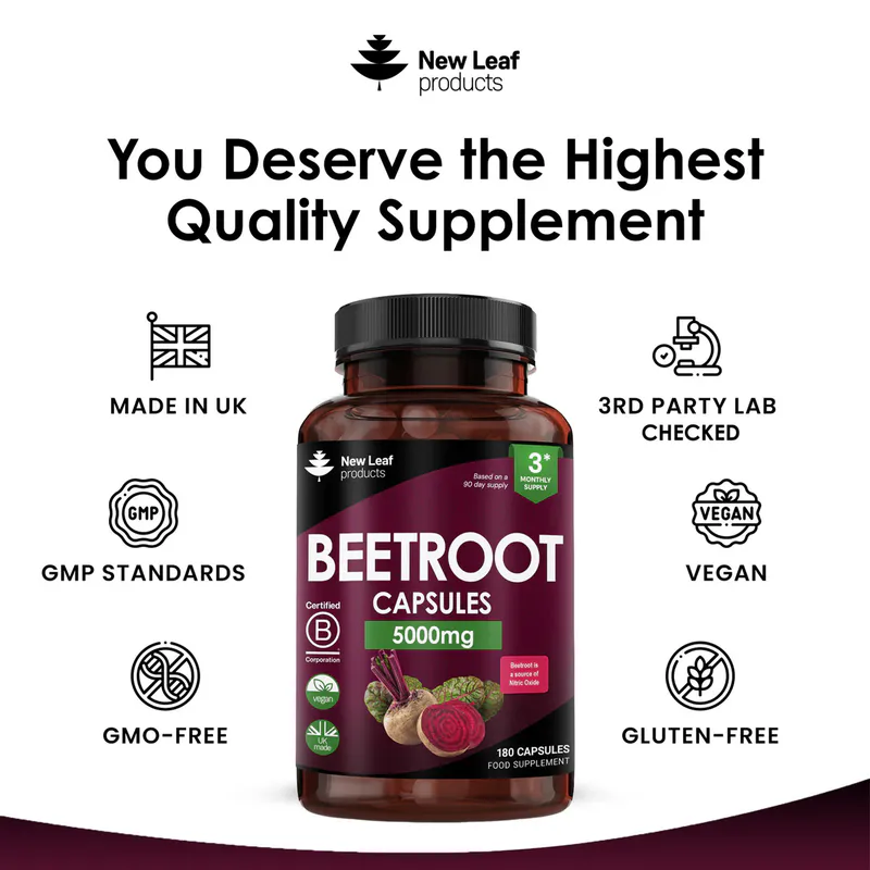 New Leaf Beetroot 5000mg Capsules are supplied as 180 Capsules (3 Month Supply) for blood flow and performance support.