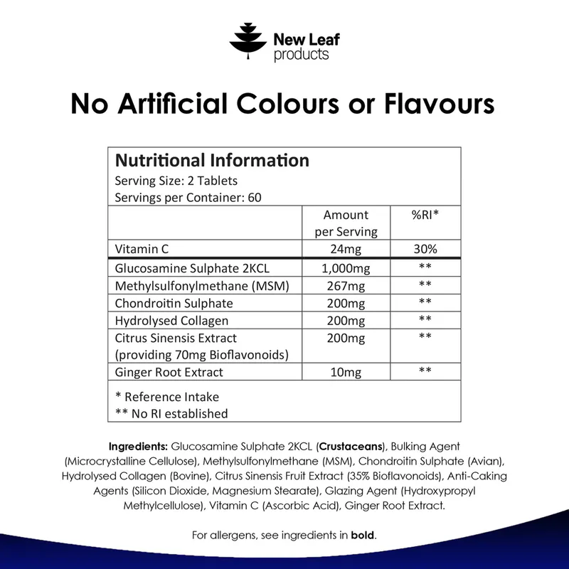 Glucosamine Sulphate 2KCL (Crustaceans), Bulking Agent (Microcrystalline Cellulose), Methylsulfonylmethane (MSM), Chondroitin Sulphate (Avian), Hydrolysed Collagen (Bovine), Citrus Sinensis Fruit Extract (35% Bioflavonoids), Anti-Caking Agent (Silicon Dioxide, Magnesium Stearate), Glazing Agent (Hydroxypropyl Methylcellulose), Vitamin C (Ascorbic Acid), Ginger Root Extract.