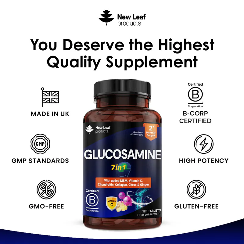 New Leaf’s Glucosamine 7-in-1 Complex delivers 1900mg per serving from a carefully selected blend of Glucosamine, MSM, Chondroitin, Collagen, Vitamin C, Citrus, and Ginger. Each bottle contains 120 tablets, providing a two-month supply. Formulated to support bones and joints, this comprehensive supplement offers a well-rounded approach to maintaining mobility and structural health in just two tablets per day.