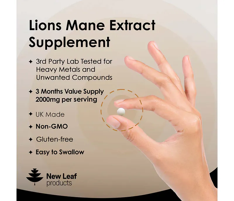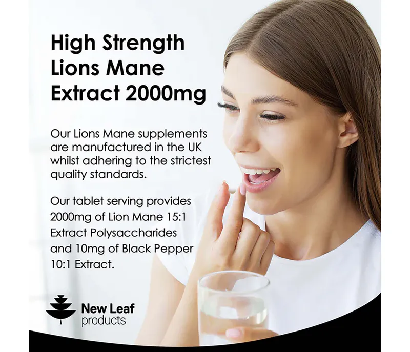 New Leaf Lions Mane 2000mg is a potent mushroom supplement supplied as 180 Tablets (3 Month Supply) for cognitive and nerve support.