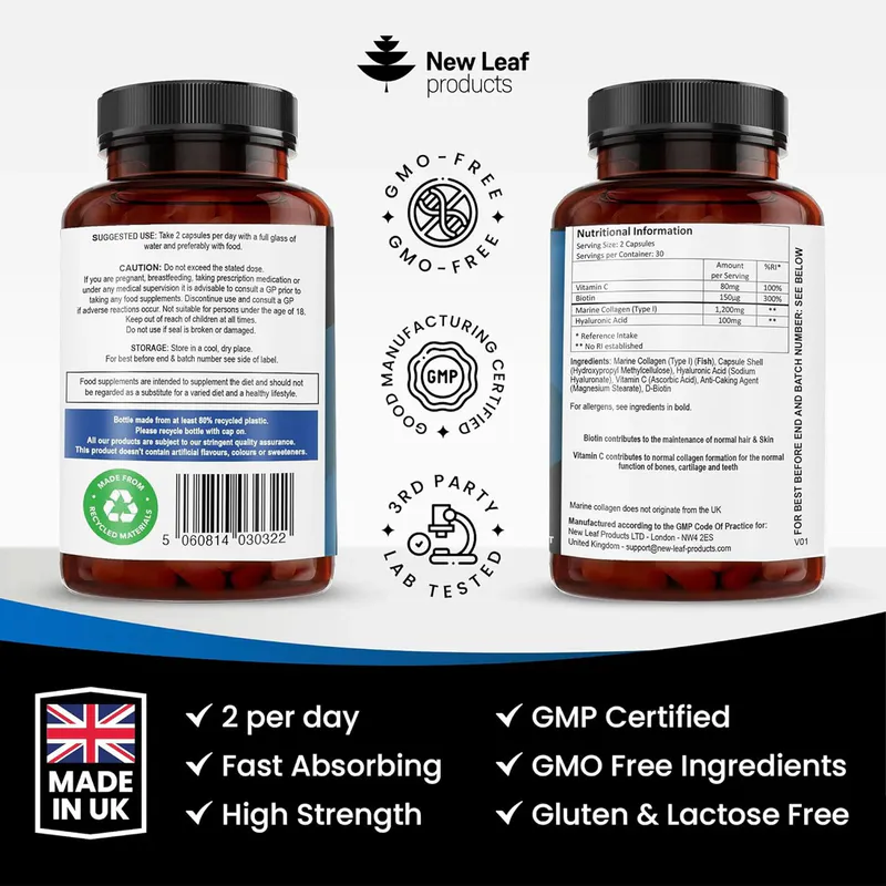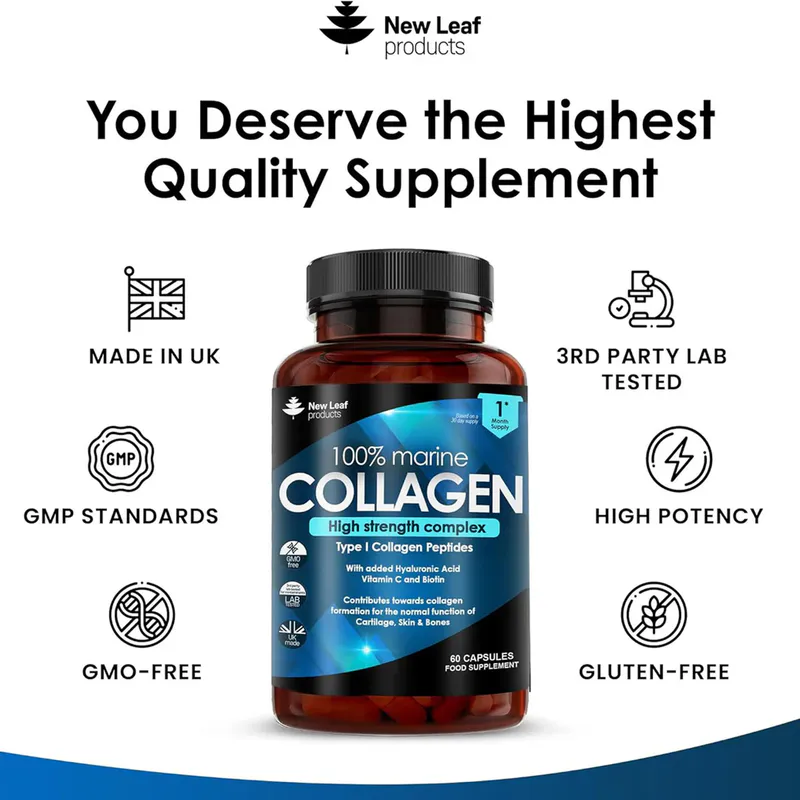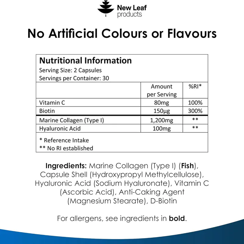 New Leaf Marine Collagen Complex is a beauty supplement supplied as 60 Capsules (1 Month Supply) for skin and joint support.