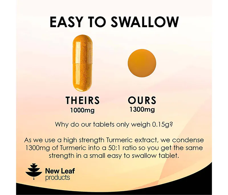 New Leaf Turmeric Curcumin, Ginger & Black Pepper Tablets offers an easy to swallow, vegan-friendly way to consume turmeric. Curcumin, the active compound in turmeric, gives the herb medicinal properties. Turmeric is a disease-fighting, immune-boosting herb with antibacterial and anti-inflammatory properties. It also helps control blood sugar, cholesterol levels and eases pain and swelling. The infusion of black pepper and ginger aids absorption and provides a tasteless way to consume your daily dose of curcumin. Free of gluten and GMOs, specialists have formulated this supplement to ensure that everyone can consume it.