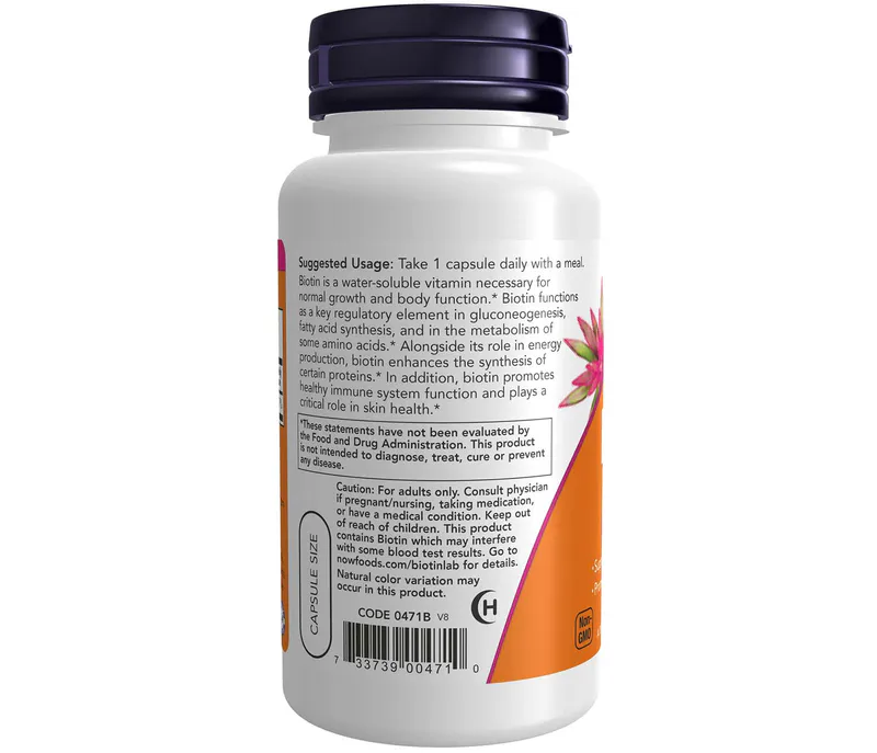 NOW Foods Biotin 5000mcg is a B-vitamin supplement supplied as 60 Veg Capsules, essential for healthy hair, skin, and nails.