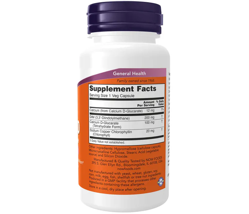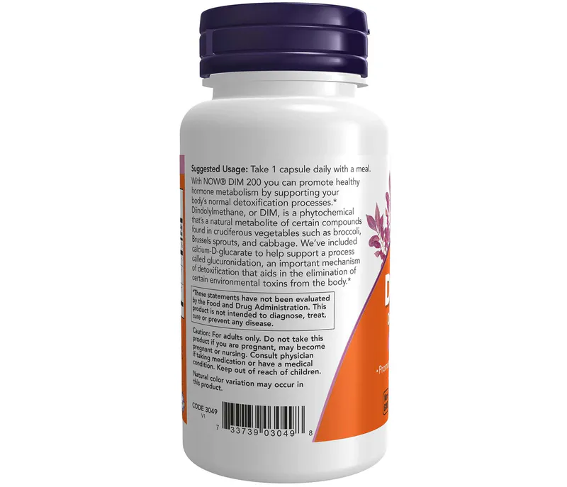 With NOW® DIM 200 you can promote healthy hormone metabolism by supporting your body’s normal detoxification processes.* Diindolylmethane, or DIM, is a phytochemical that’s a natural metabolite of certain compounds found in cruciferous vegetables such as broccoli, Brussels sprouts, and cabbage. We’ve included calcium-D-glucarate to help support a process called glucuronidation, an important mechanism of detoxification that aids in the elimination of certain environmental toxins from the body.*