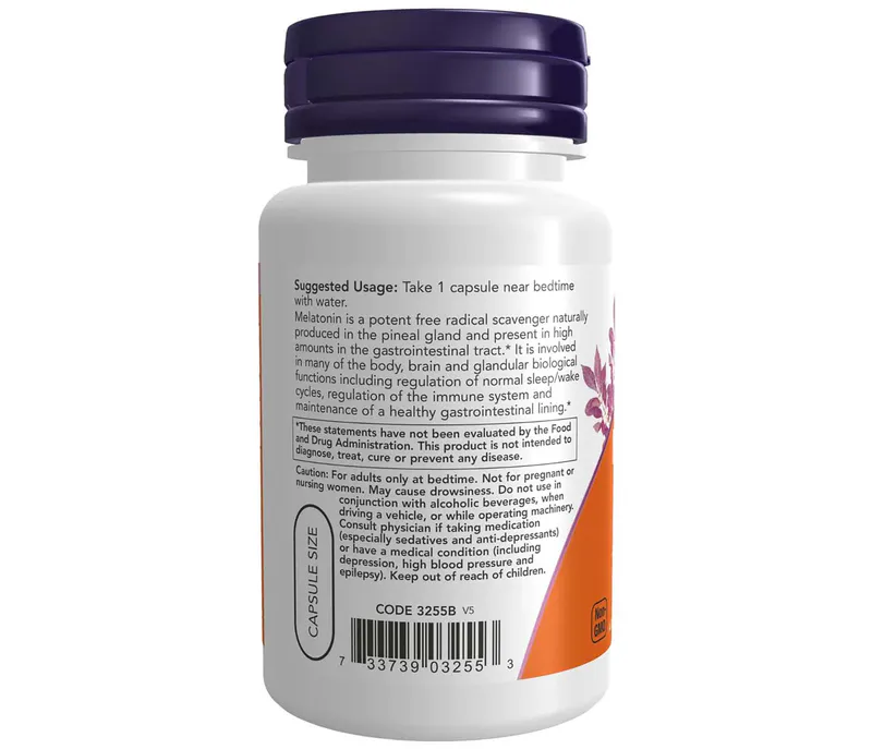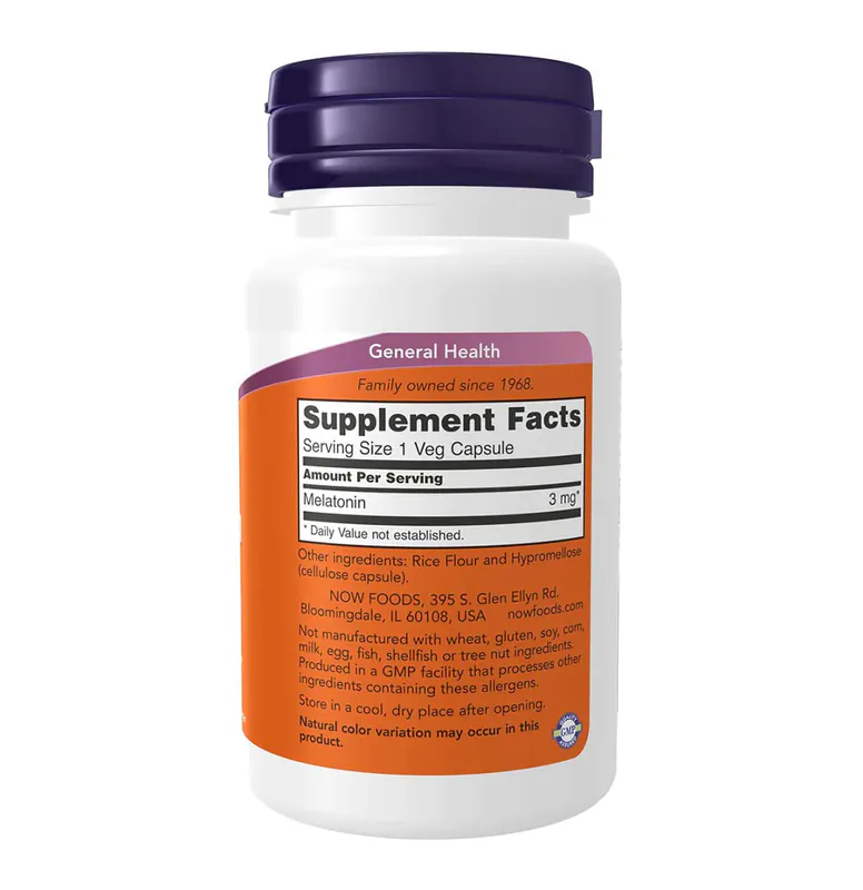 NOW Foods Melatonin 3mg is a natural hormone supplement to help regulate sleep-wake cycles, supplied as 60 Veg Capsules.