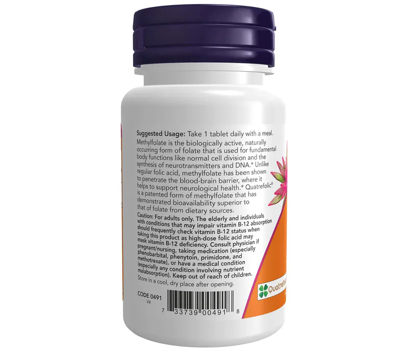 Methylfolate is the biologically active, naturally occurring form of folate that is used for fundamental body functions like normal cell division and the synthesis of neurotransmitters and DNA.* Unlike regular folic acid, methylfolate has been shown to penetrate the blood-brain barrier, where it helps to support neurological health.* Quatrefolic® is a patented form of methylfolate that has demonstrated bioavailability superior to that of folate from dietary sources.