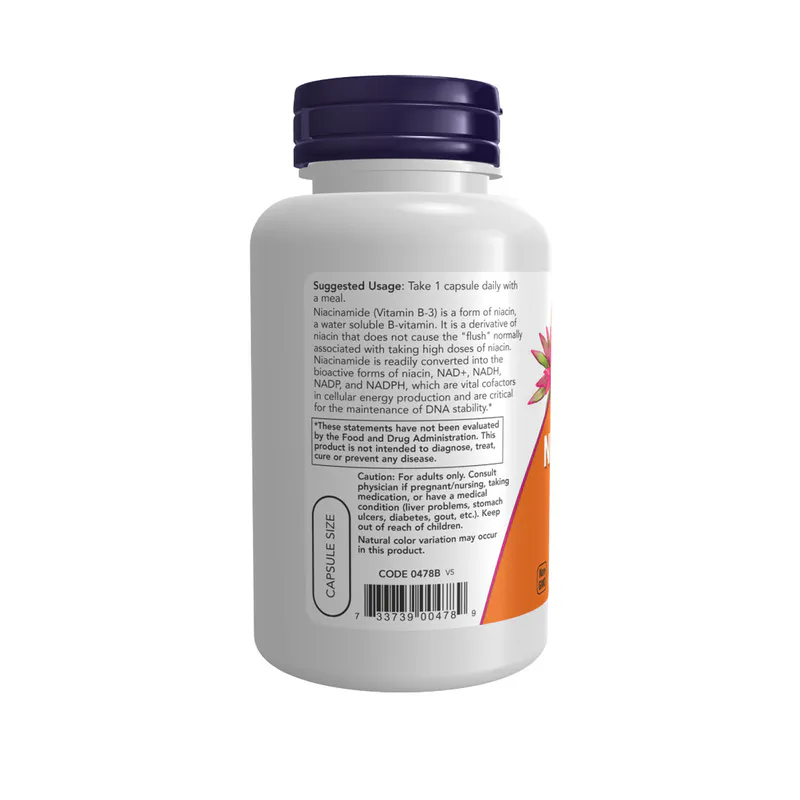 NOW Foods Niacinamide B3 500mg is a flush-free form of Niacin, a B-vitamin supplied as 100 Veg Capsules for joint and skin health.