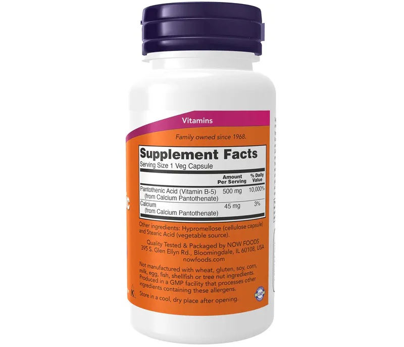 NOW Foods Pantothenic Acid 500mg (Vitamin B5) is supplied as 100 Veg Capsules, important for energy production and adrenal gland function.