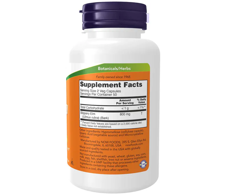 NOW Foods Slippery Elm 400mg is a traditional botanical formula supplied as 100 Veg Capsules, known for its soothing mucilage content for the digestive tract.