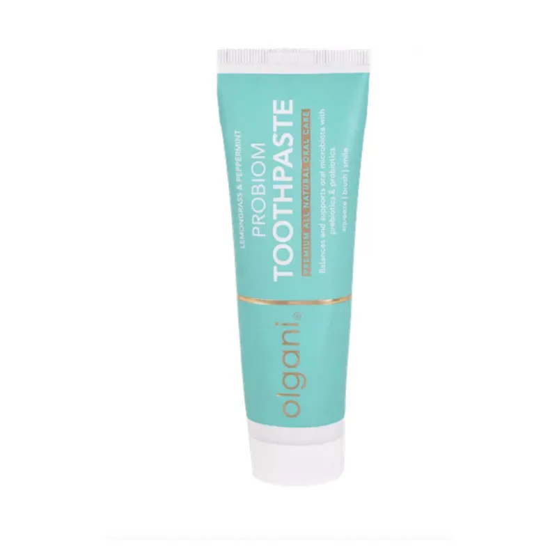 Olgani’s Probiom toothpaste is free of fluoride, glycerine, sorbitol, artificial preservatives, GMOs, taste enhancers, dyes, abrasives, foaming agents, titanium dioxide, artificial sweeteners, and fillers.