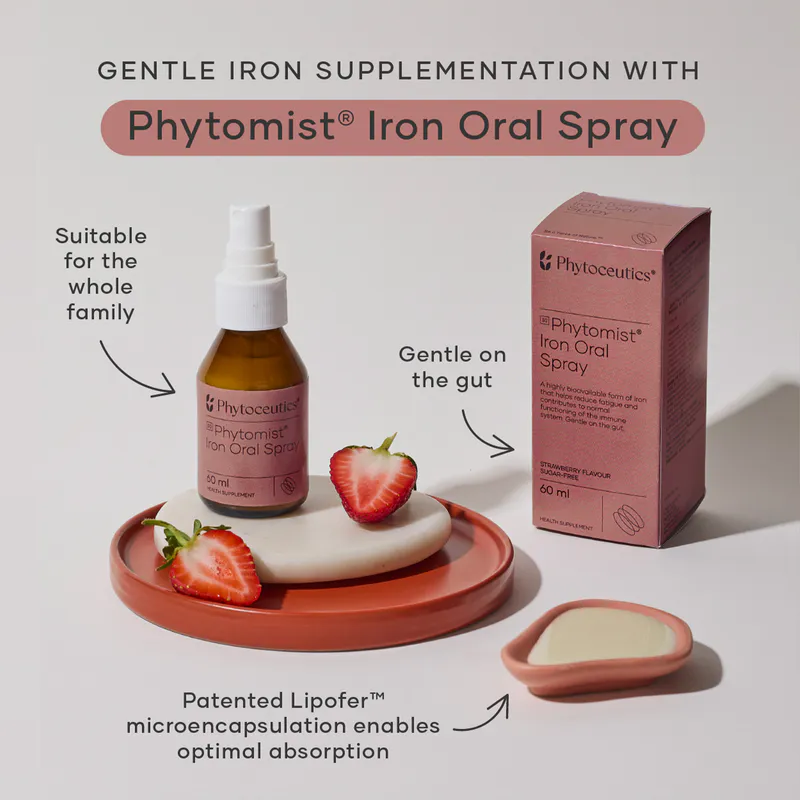 Phytoceutics Phytomist® Iron Oral Spray is designed to provide a gentle, effective, and convenient way to replenish iron levels. The unique spray delivery system allows for direct absorption, and features Lipofer™ microencapsulation technology that offers a more bioavailable form of iron while minimising the digestive discomfort often associated with iron supplements. Unlike traditional iron supplements, the Phytomist® Iron Oral Spray has almost no metallic aftertaste, and is formulated with a pleasant strawberry flavour to enhance palatability, making it easier to be consistent with your iron supplementation. Iron is crucial to help combat fatigue and tiredness, and assists with the normal functioning of the immune system.