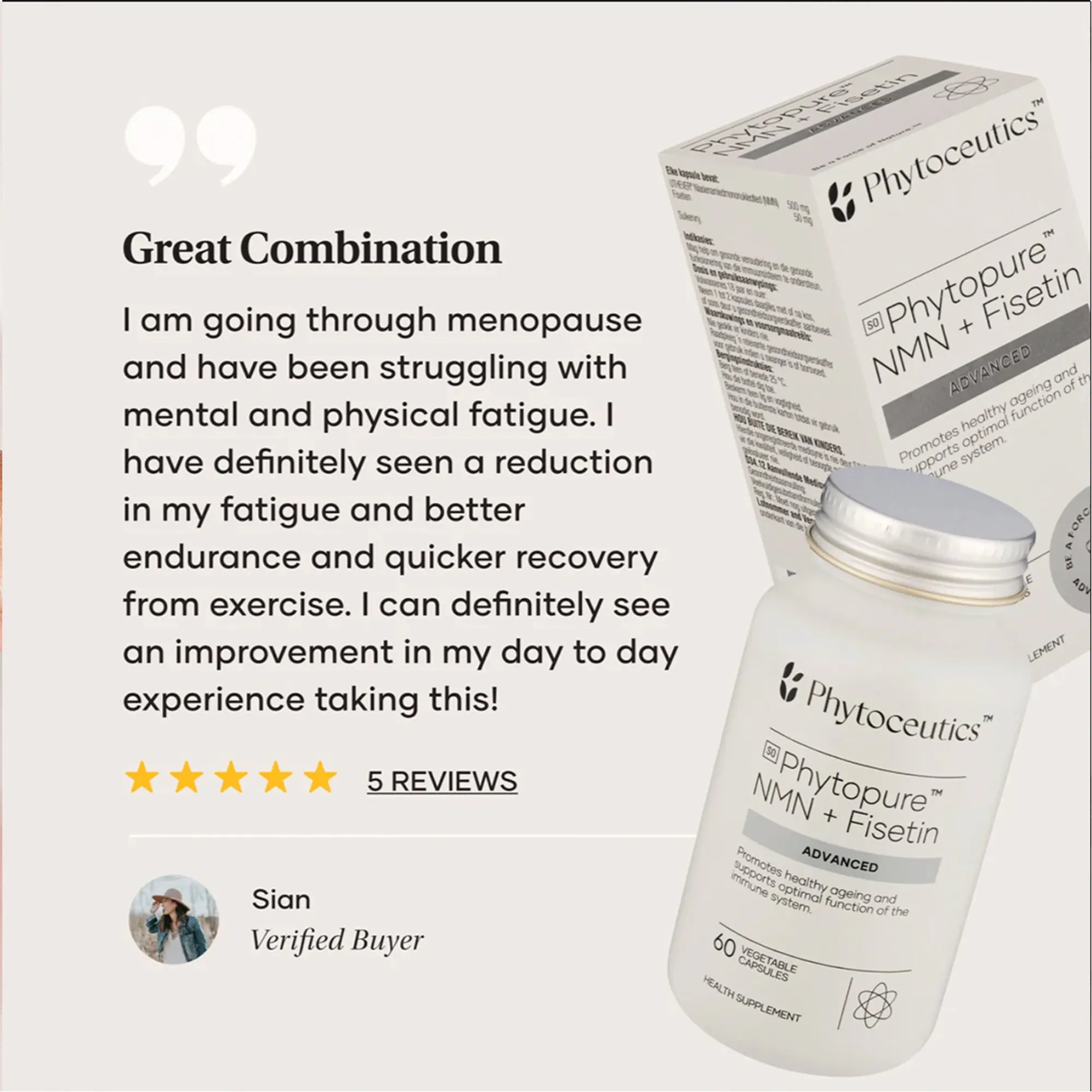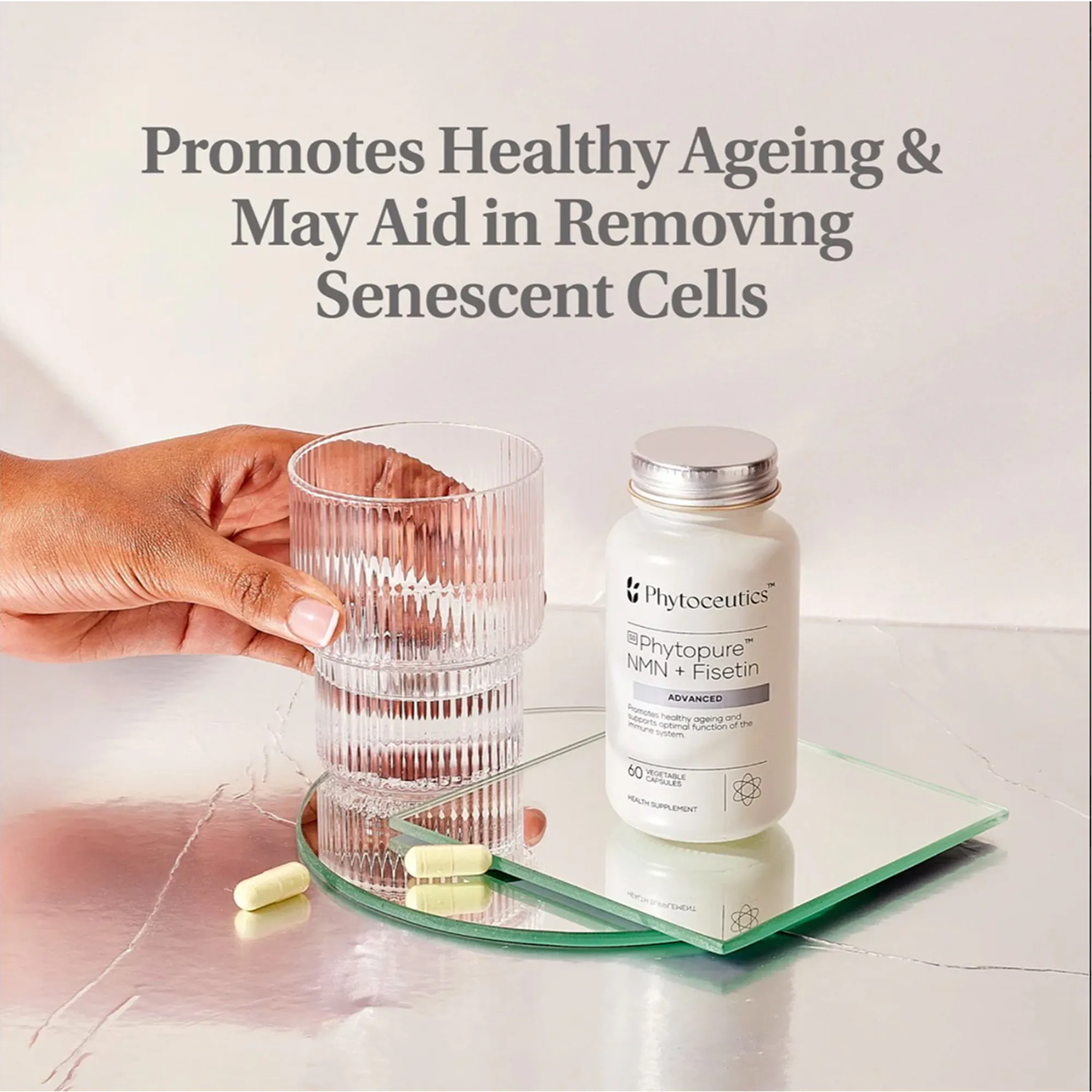 Phytopure® NMN+ Fisetin Advanced is a health supplement formulated for adults 18 years and older to support healthy ageing and the healthy functioning of the immune system. The combination of nicotinamide mononucleotide (NMN) and fisetin may help to increase NAD+ levels, promote cellular energy, and target senescent cells associated with age-related decline. This sugar-free formulation provides a convenient way to supplement your diet with these beneficial compounds.