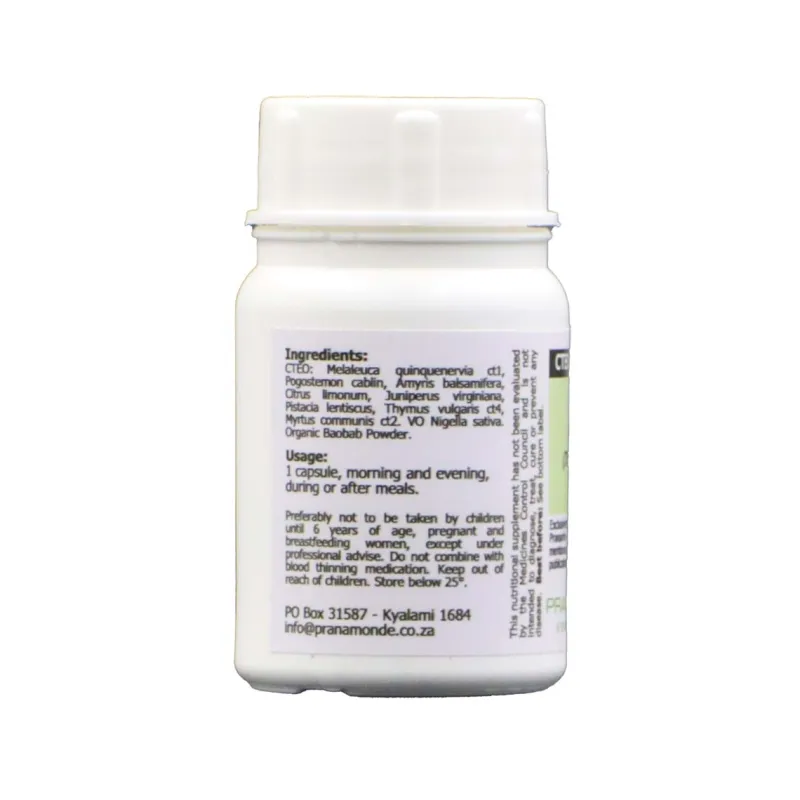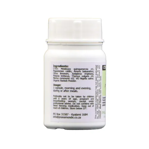 - 75 mg CTEO per capsule: Niaouli, Patchouli, Amyris (wood), Lemon (peel), Juniper, Mastic, Thyme, Myrtle.