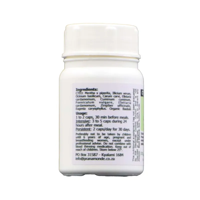 - CTEO (60 mg / capsule): Peppermint, Basil, Aniseed, Cumin, Caraway, Ginger, Clove.