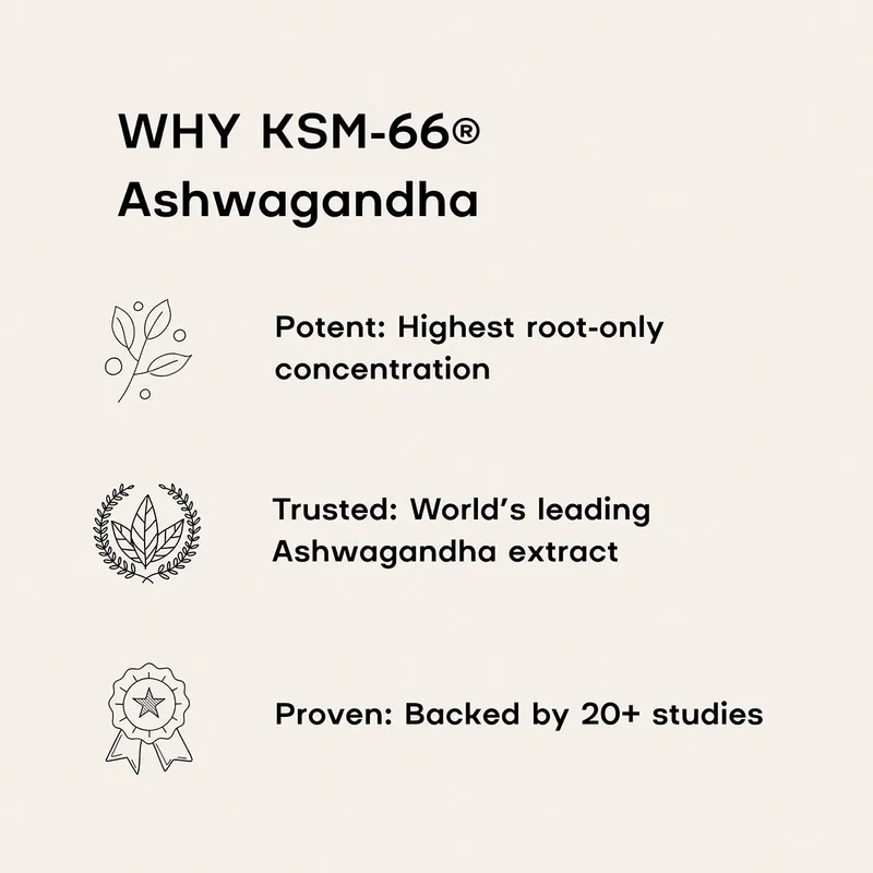 KSM-66® Ashwagandha, widely recognised as the world's best Ashwagandha extract, is a full-spectrum root extract backed by over 24 clinical studies. This premium form provides the highest concentration of key compounds while maintaining the natural balance of the herb through its unique extraction process.