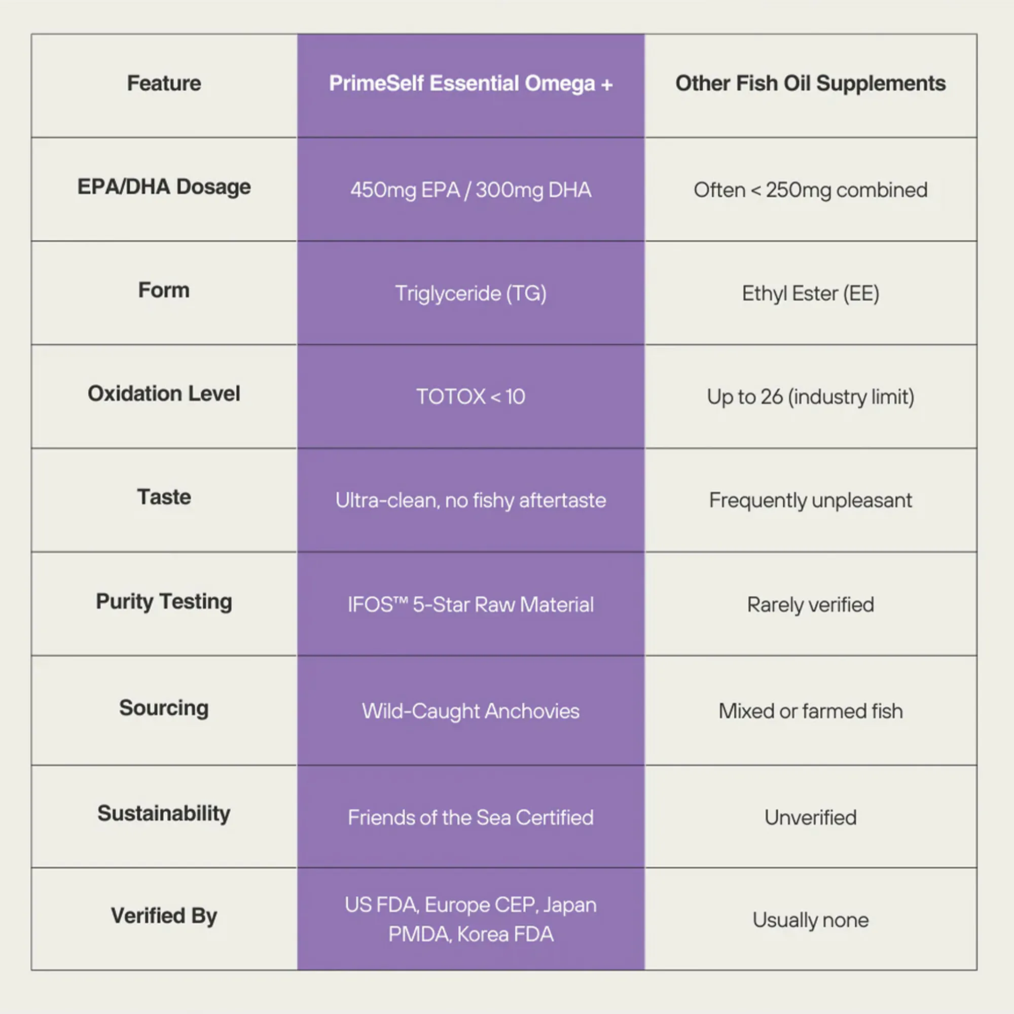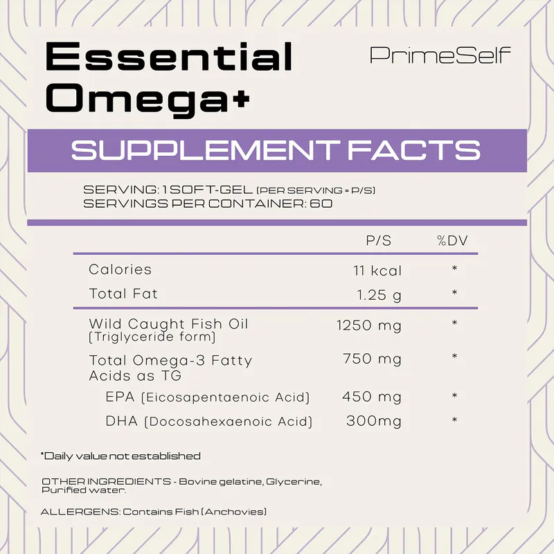 PrimeSelf Essential Omega+ delivers 750 mg of EPA+DHA per softgel (450 mg EPA | 300 mg DHA) in the highly bioavailable triglyceride (TG) form - sourced from wild‑caught anchovies and verified using IFOS™ 5‑Star certified raw material. Expect clean absorption, ultra‑low oxidation, and no fishy aftertaste - just results you can feel across focus, heart, recovery, and resilience.