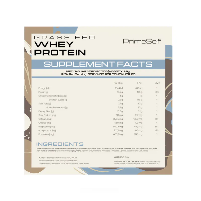 PrimeSelf Grass Fed Whey Protein (Salted Dark Chocolate) is a high-quality powder supplied in a 725g container.