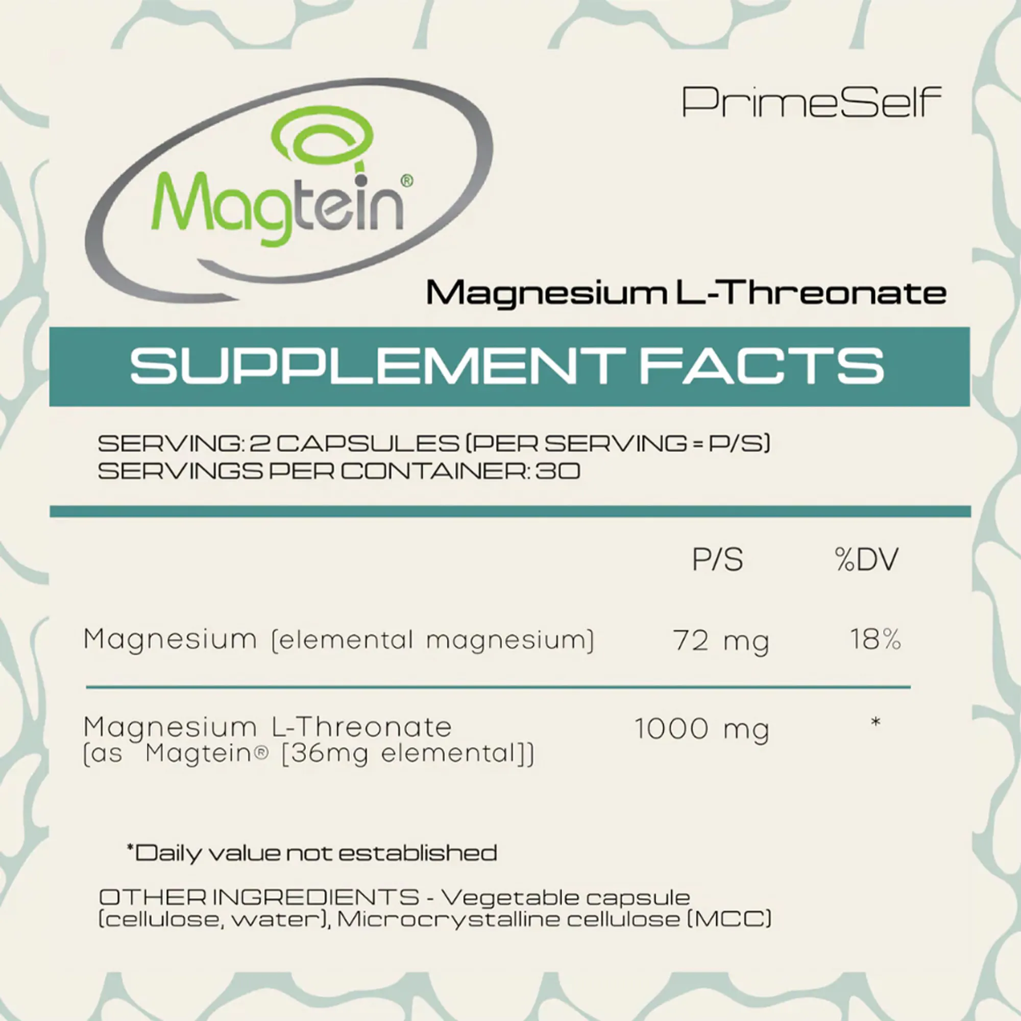 - Active Ingredient: Magtein® Magnesium L-Threonate (500mg, providing 36mg elemental magnesium)