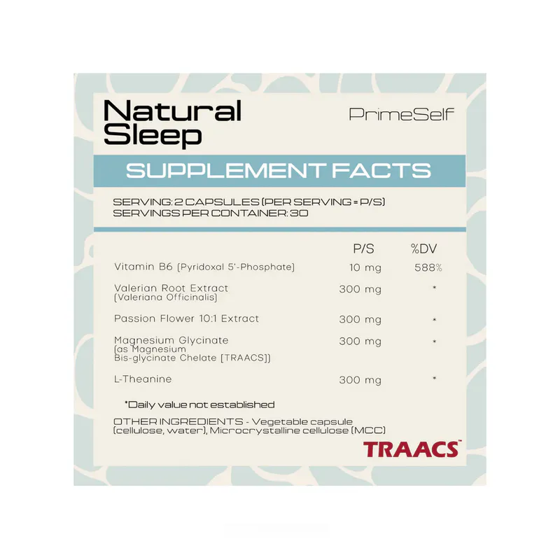 Vitamin B6 (Pyridoxal 5’ Phosphate)10mg, Valerian Root Extract 300mg, Passion Flower 10:1 Extract 300mg, Magnesium Glycinate (TRAACS®) 300mg, L Theanine 300mg