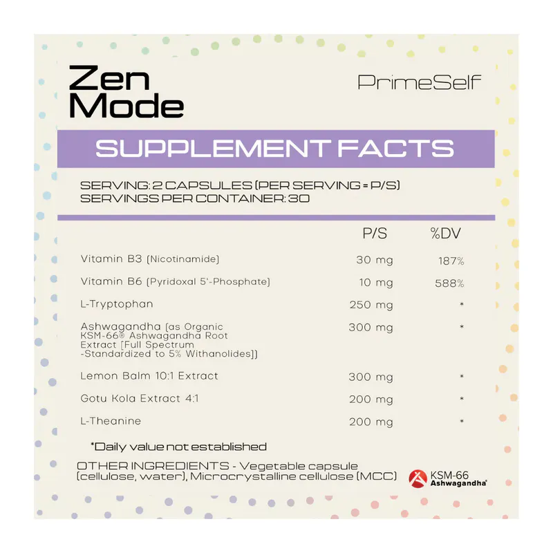 PrimeSelf Zen Mode is a relaxation supplement supplied as 60 Capsules for stress relief and calm.