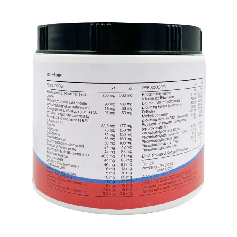 Vitamin B1, Vitamin B2, Vitamin B3, Vitamin B5, Vitamin B6, Vitamin B6, Vitamin B12, Folic acid, Vitamin C, Phosphatidylserine, Choline bitartrate, Magnesium citrate, Chromium, Manganese sulphate, Zinc oxide, Taurine, L-arginine, L-glutamine, L-tyrosine, Co-enzyme Q10, Betaine, Gingko biloba extract, Canola oil, Cacao, Vanilla (natural), Debittered Stevia, Lecithin.