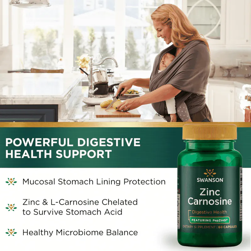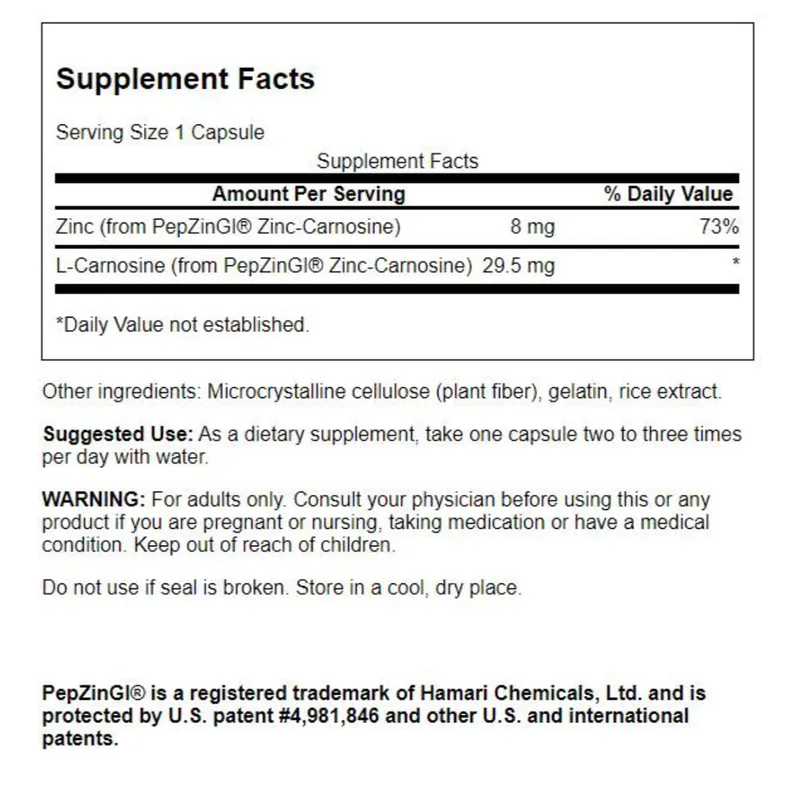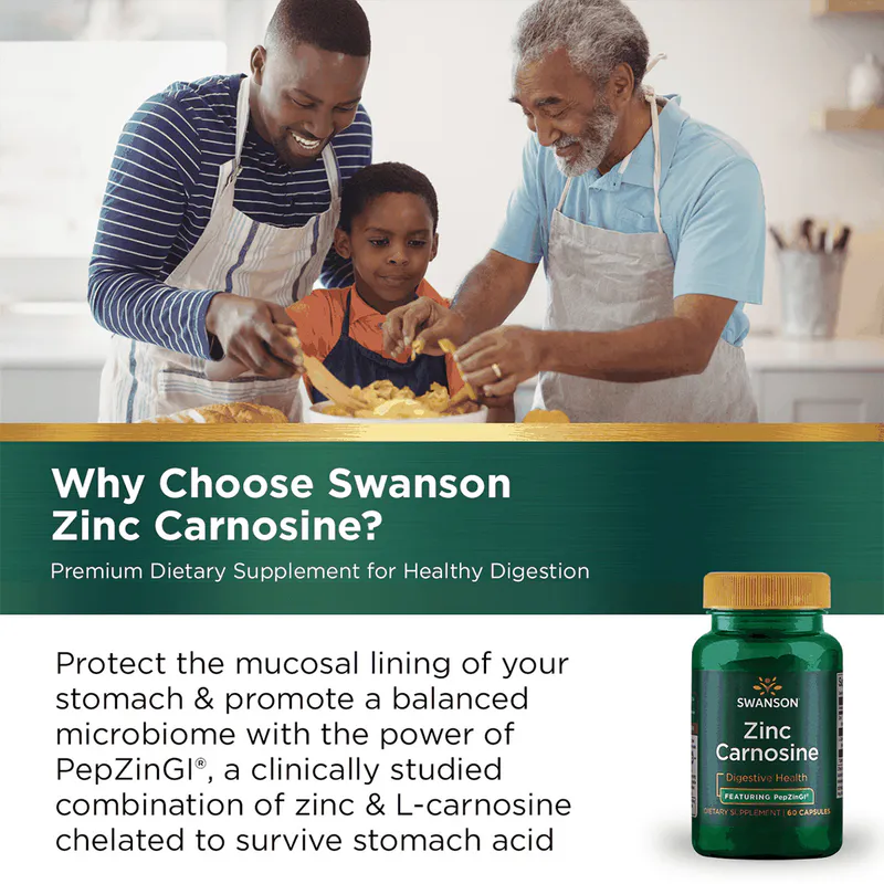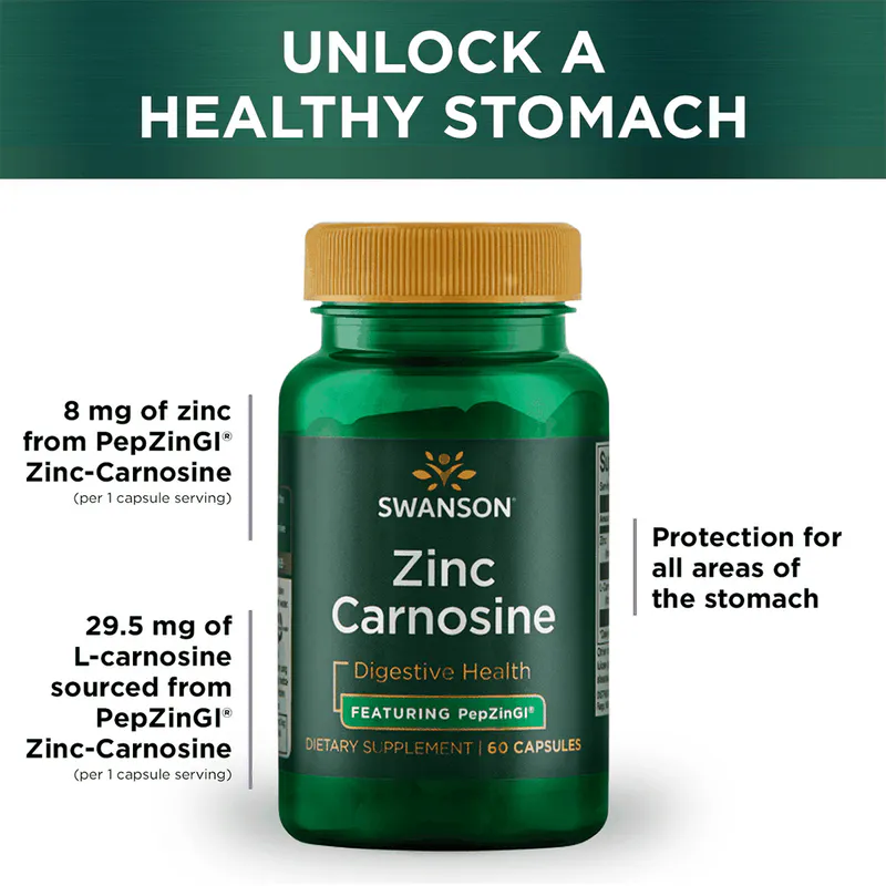 - Swanson Zinc Carnosine features the patented PepZinGI®, a scientifically formulated blend of zinc and L-carnosine designed to support gastrointestinal health.