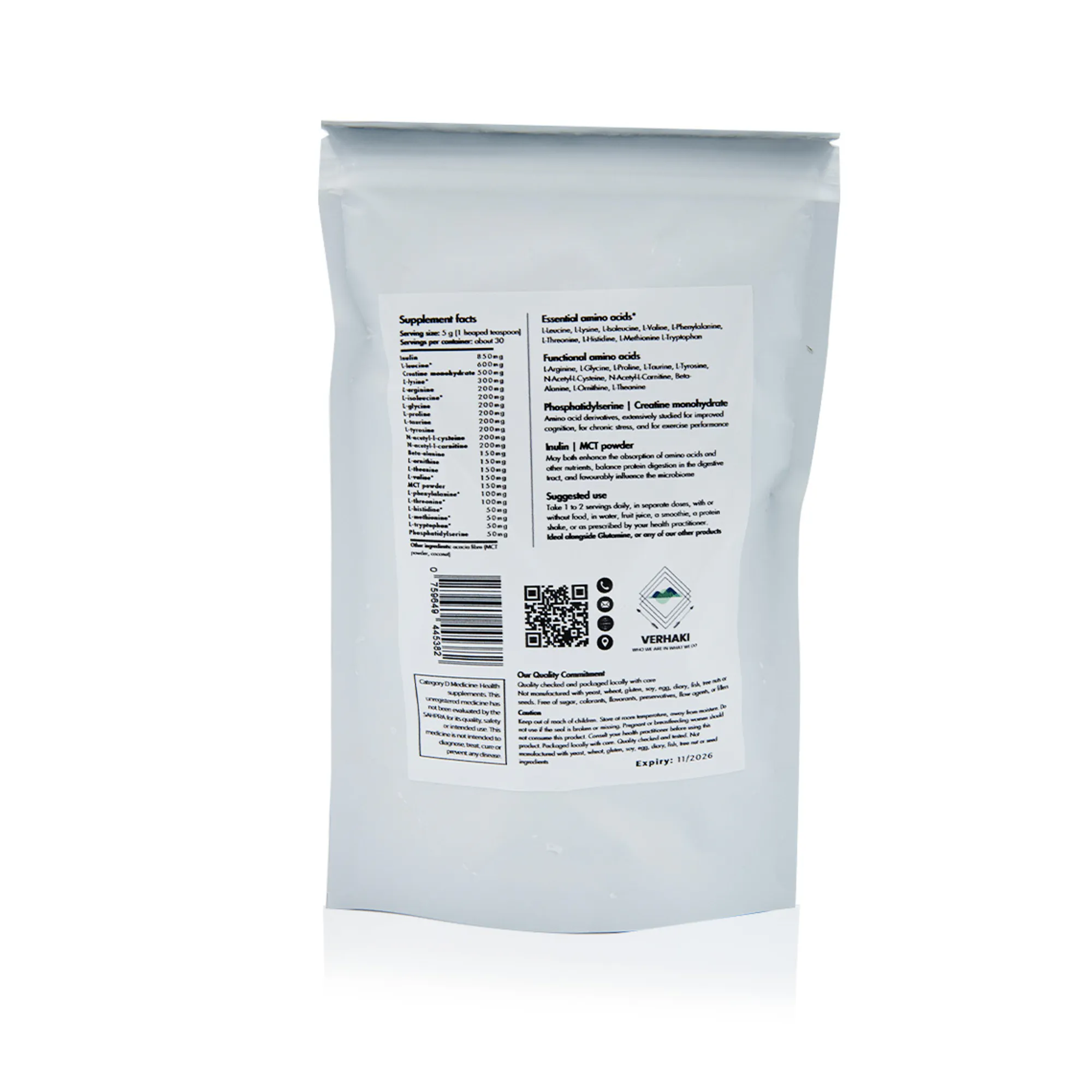 Verhaki MultiAmino is an amino acid blend powder supplied in a 150g container.
