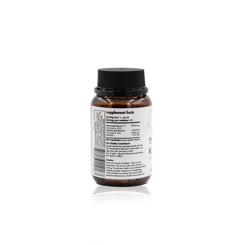 Verhaki Nutraceuticals K2ciferol is a synergistic Vitamin D3 1000IU and K2 supplement supplied as 60 Capsules for bone and cardiovascular health.